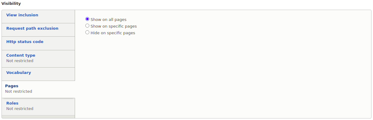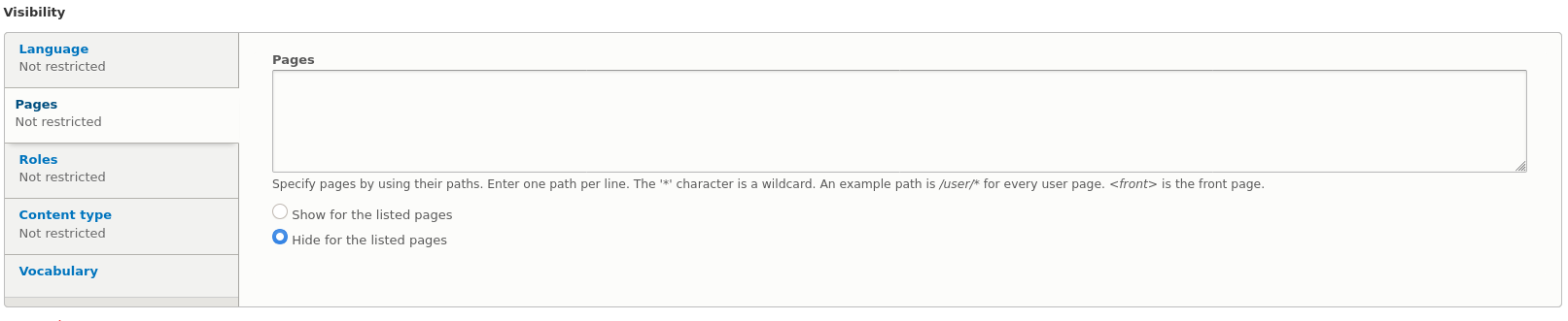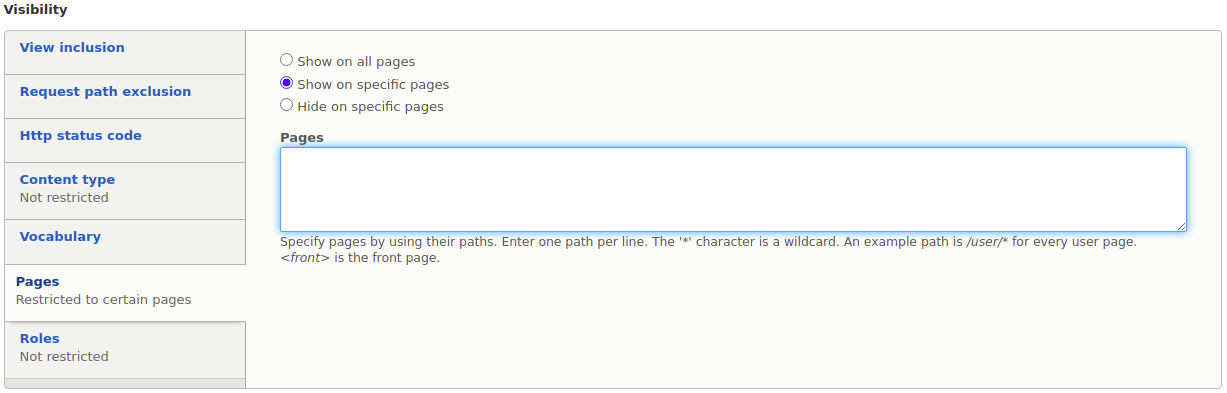 - Show for the listed pages will result in the block showing on all pages when the list is empty