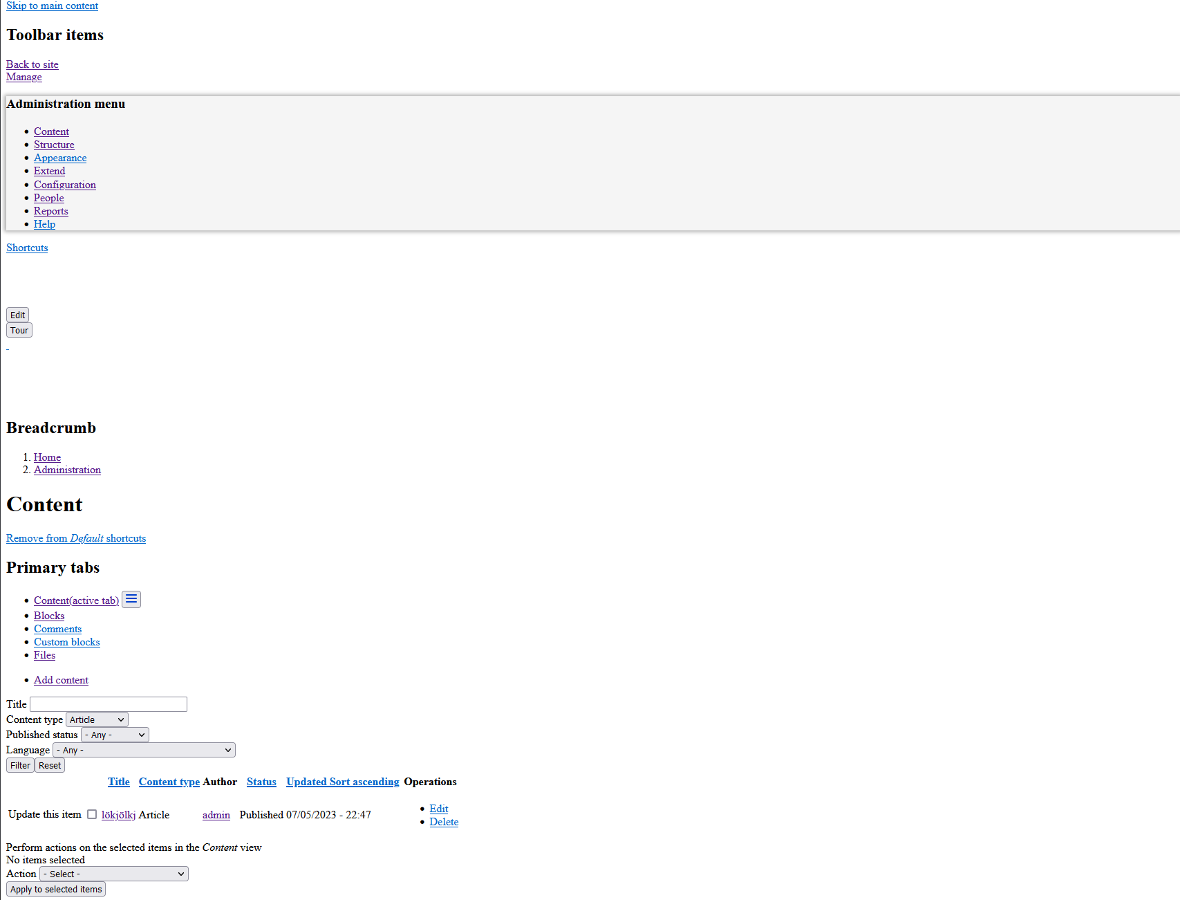 - Visit /admin/content and apply a filter (e.g. Type = Article)